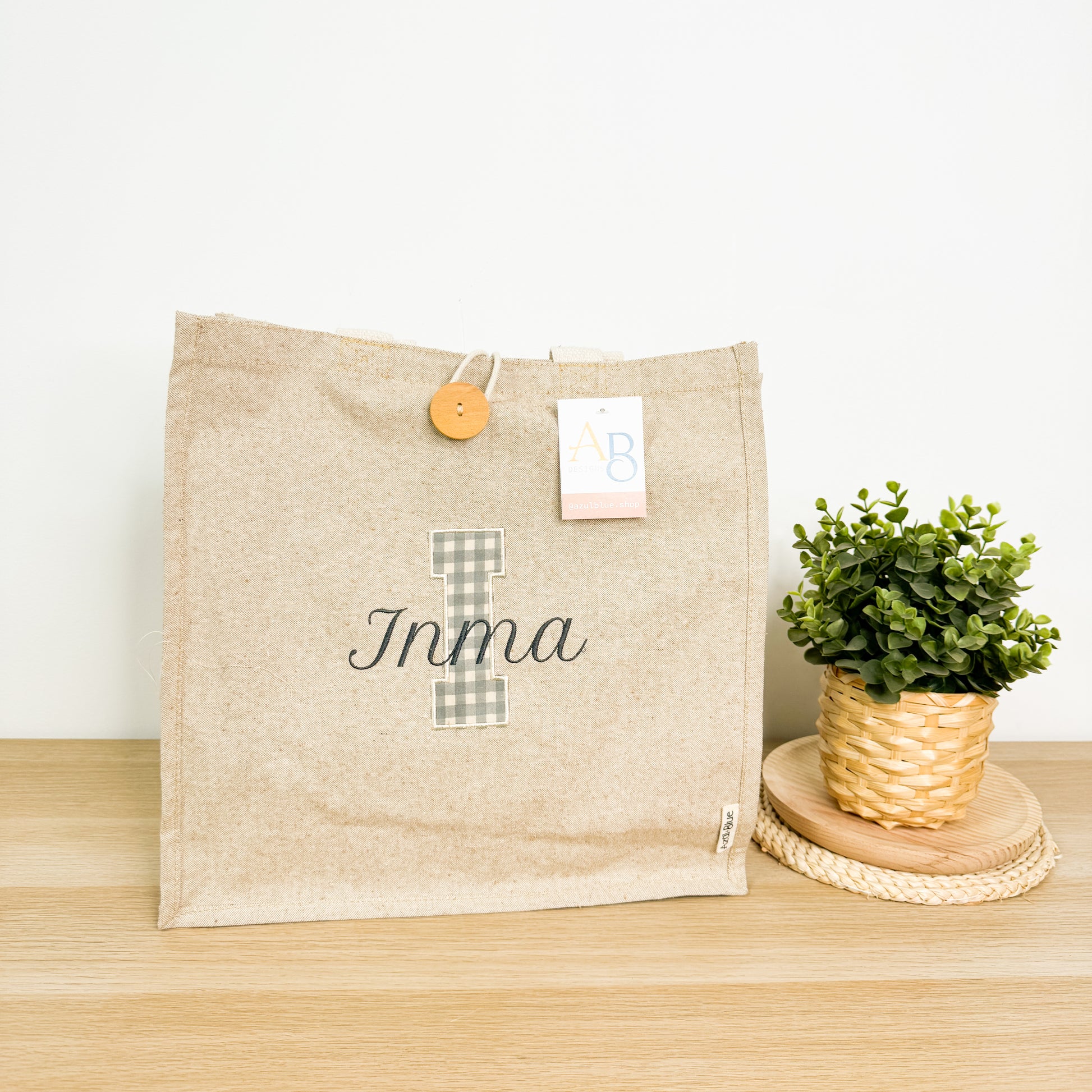 Bolsa de tela con asa y botón en madera con inicial de tela y nombre bordado