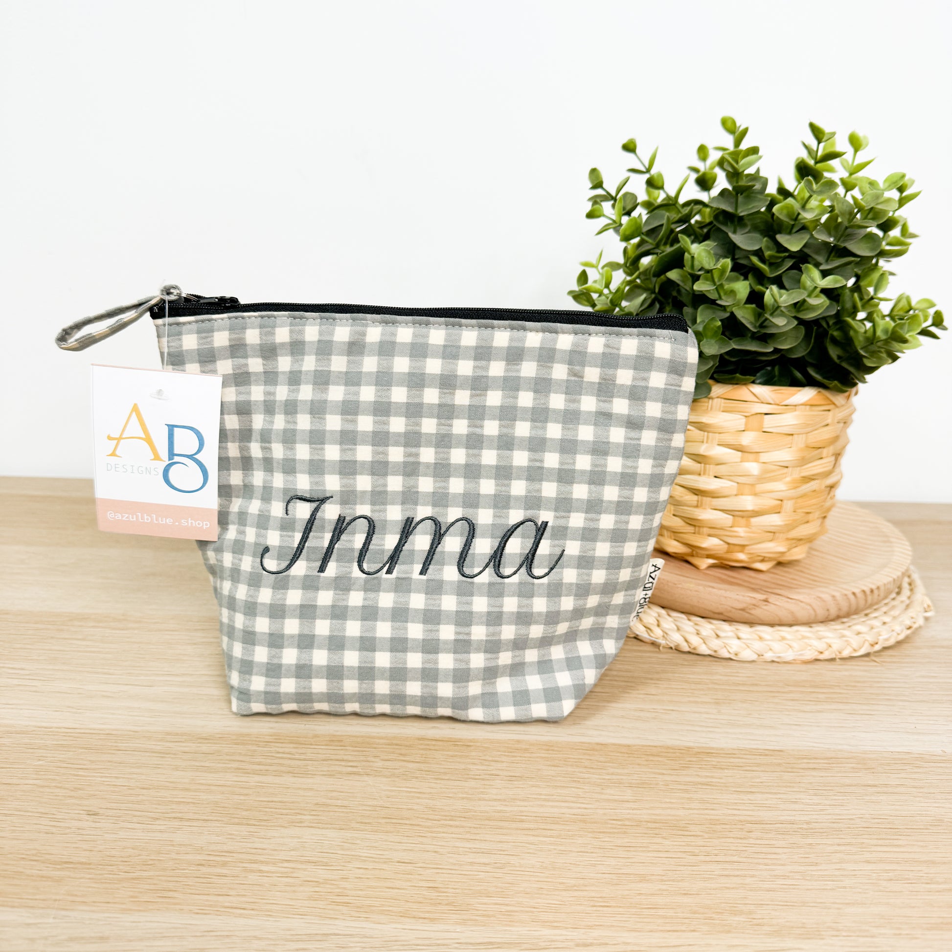 Neceser hecho a mano con tela estampada vichy gris y beige y con bordado personalizado