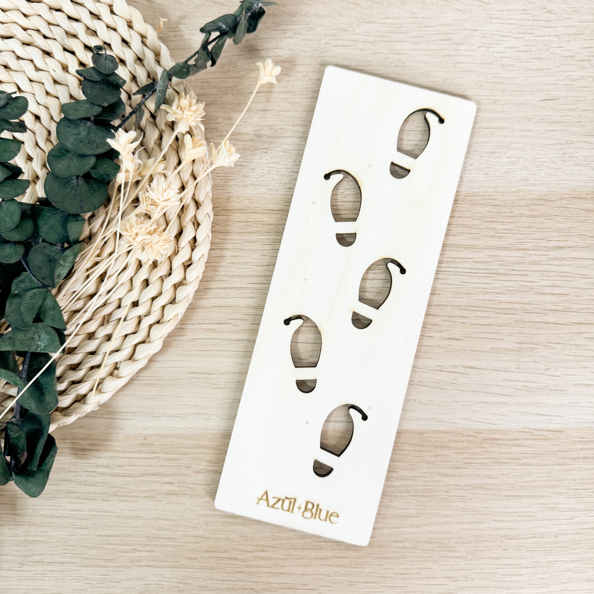 Fabricada en madera natural y cortada a láser con gran precisión, esta plantilla permite crear huellas perfectas con harina, azúcar glas o nieve artificial, simulando el paso del elfo por tu casa